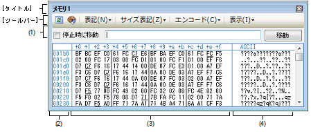 メモリ検索 ダイアログをオープンします。 検索対象となる箇所は,メモリ値エリアと文字列エリア(浮動小数点数値表示を選択している場合を除く)のうち,キャレットのあるエリア内となります。 |