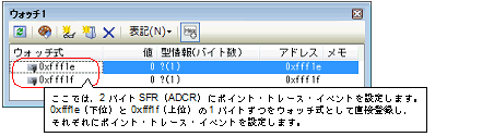 IECUBEを使用して,16ビット(2バイト)の変数/SFRにポイント・トレース・イベントを設定する場合は,対象となる変数/SFRの上位8ビット/下位8ビットのアドレスを直接ウォッチ パネルのウォッチ式として登録します(「2.10.6.1 ウォッチ式を登録する」参照)。