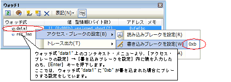 なお,この際に,コンテキスト・メニュー内のテキスト・ボックスに値を指定した場合,指定した値で読み込み/書き込みを行った場合のみブレークします。値を指定しない場合は,値にかかわらず,選択しているウォッチ式に読み込み/書き込みを行った場合にブレークします。