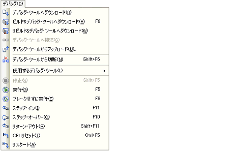 デバッグ・ツールバー,および[デバッグ]メニューの各項目は,デバッグ・ツールと接続時のみ有効となります。