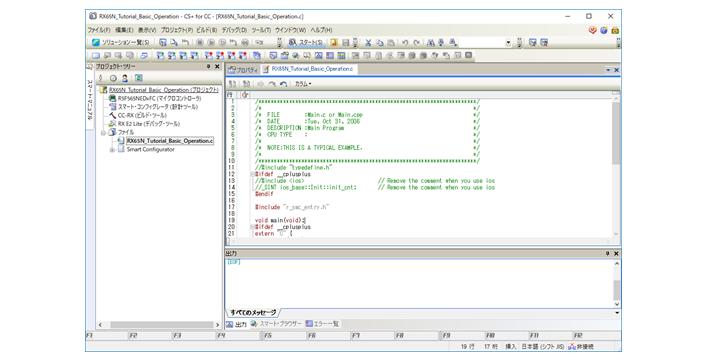 「サンプル・プロジェクトを読み込む」欄の[RX]タブからRX65N_Tutorial_Basic_Operationを選択し,[GO]ボタンをクリックしてください。