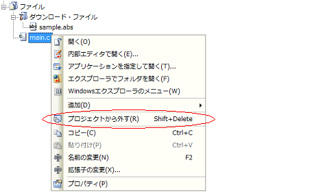 上記の操作により追加したファイルをデバッグ専用プロジェクトから外すには,プロジェクト・ツリー で対象のファイルを選択したのち,コンテキスト・メニューの[プロジェクトから外す]を選択してください。