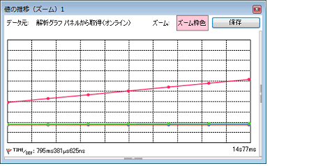 ズーム表示範囲の設定は,[ズーム]コンボ・ボックスにおいて表示対象となる値の推移(ズーム) パネルの番号を選択したのち,ズーム表示したい領域をマウスでクリック&ドラッグすることで行います。この時グラフ上に表示されるドラッグ領域を示すズーム枠が表示されている限り,同動作でズーム表示範囲は再設定されます。