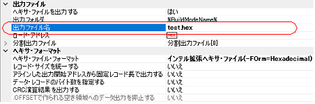 プロジェクト・ツリーでビルド・ツール・ノードを選択し,プロパティ パネルの[ヘキサ出力オプション]タブを選択します。[出力ファイル]カテゴリの[出力ファイル名]プロパティにおいて,変更するファイル名を入力してください。