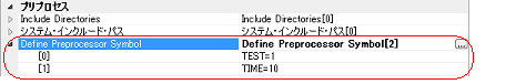 定義マクロの設定は,[プリプロセス]カテゴリの[Define Preprocessor Symbol]プロパティで行います。