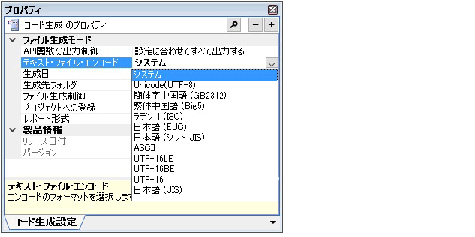 コード生成では,プロパティ パネルの[コード生成設定]タブ→[ファイル生成モード]→[テキスト・ファイル・エンコード]でソース・コードのエンコードを変更することができます。