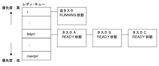 備考 本サービス・コールを発行した際,対象タスクがRUNNING状態,またはREADY状態であった場合には,優先度の変更処理を実行したのち,パラメータtskpriで指定された優先度に対応したレディ・キューの最後尾にキューイングし直す処理もあわせて実行されます。