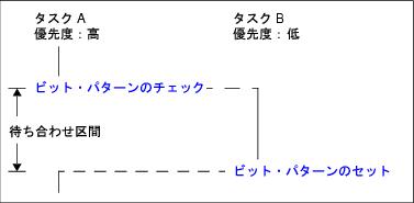 マルチタスク処理では,あるタスクの処理結果が出るまでの間,他タスクが処理の実行を待つといったタスク間の待ち合わせ機能(事象の発生有無を判断できる機能)が必要となります。そこで,RI850V4では,このようなタスク間の待ち合わせ機能として“32ビット幅のイベントフラグ”を提供しています。