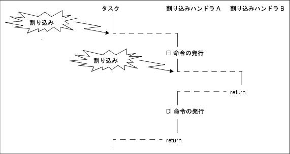 なお,RI850V4では,割り込みハンドラを“タスクとは独立したもの(非タスク)”として位置づけています。このため,EIレベル・マスカブル割り込みが発生した際には,システム内で最高優先度を持つタスクが処理を実行中であっても,その処理は中断され,割り込みハンドラに制御が移ります。