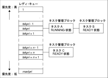 なお,RI850V4におけるレディ・キューは,優先度をキーとしたハッシュ・テーブルであり,実行可能な状態(RUNNING状態,またはREADY状態)へと遷移したタスクの管理ブロック(タスク管理ブロック)がFIFO順でキューイングされます。このため,スケジューラは,起動された際にレディ・キューの優先度高位から検出処理を実行し,キューイングされているタスクを検出した場合には,該当優先度の先頭タスクにCPUの利用権を与えることにより,RI850V4のスケジューリング方式(優先度方式,FCFS方式)を実現しています。