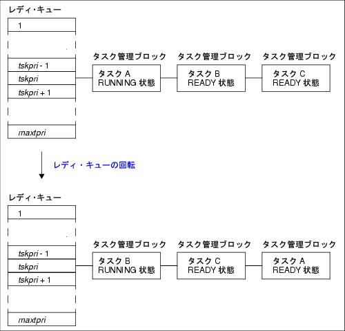 パラメータtskpriで指定された優先度に対応したレディ・キューの先頭タスクを最後尾につなぎかえ,タスクの実行順序を明示的に変更します。