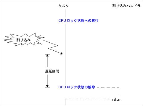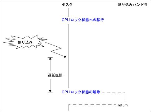 なお,RI850V4では,本サービス・コールの発行からunl_cpu,またはiunl_cpuが発行されるまでの間にEIレベル・マスカブル割り込みが発生した場合には,該当割り込み処理(割り込みハンドラ)への移行をunl_cpu,またはiunl_cpuが発行されるまで遅延しています。