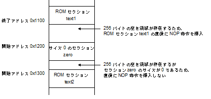 ROMセクションとRAMセクションは,ROMセクションより大きいアドレスにRAMセクションが配置された場合に限り,NOP命令を挿入します(ROMセクションより小さいアドレスにRAMセクションが配置された場合はNOP命令を挿入しません)。 |