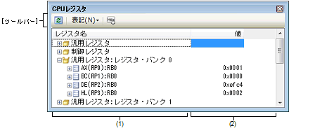 レジスタ名を示します。アイコンをダブルクリック,または“+”/“-”マークをクリックすると,下階層のレジスタ名(レジスタの部分を表す名称)を表示/非表示します。
