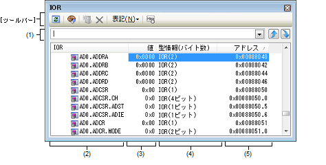 注意 | 1バイト/2バイトI/Oレジスタと,1バイト/2バイトI/Oレジスタに割り付けられている1ビットI/Oレジスタでは,値を取得するタイミングが異なります。このため,同一のI/Oレジスタの値を表示していても値が異なる場合があります。 |