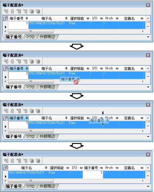 端子配置では,端子配置表の列をドラッグしたのち,移動先にドロップすることにより,表示項目の表示順序を変更(列を移動)することができます。
