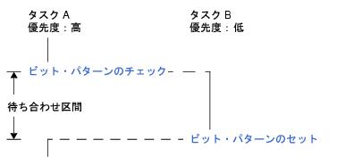 マルチタスク処理では,あるタスクの処理結果が出るまでの間,他タスクが処理の実行を待つといったタスク間の待ち合わせ機能(事象の発生有無を判断できる機能)が必要となります。そこで,RI600PXでは,このようなタスク間の待ち合わせ機能として“32ビット幅のイベントフラグ”を提供しています。