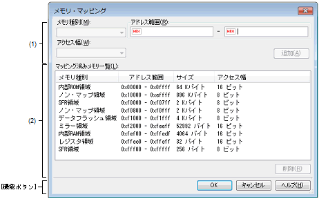 プロパティ パネルの[デバッグ・ツール設定]タブにおいて,[メモリ]カテゴリ内[メモリ・マッピング]プロパティを選択することにより表示される[...]ボタンをクリック