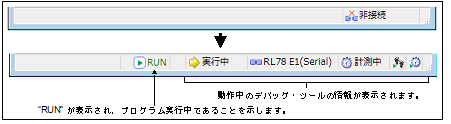 デバッグ・ツールとの接続に成功すると,メイン・ウインドウステータスバーが,次のように変化します。