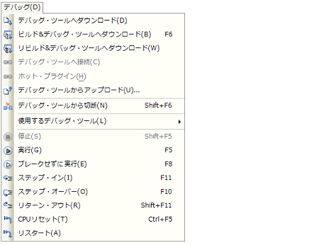デバッグ・ツールバー,および[デバッグ]メニューの各項目は,デバッグ・ツールと接続時のみ有効となります。