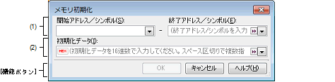 メモリ値を初期化するアドレス範囲を[開始アドレス/シンボル]と[終了アドレス/シンボル]に指定します。それぞれのテキスト・ボックスにアドレス式を直接入力するか(最大指定文字数:1024文字),またはドロップダウン・リストにより入力履歴項目(最大履歴個数:10個)を選択します。