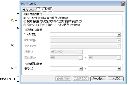 トレース パネルを逆アセンブル表示モードで表示している場合,このタブでソース・レベルの検索を行っても対象を正しく検索することはできません。 |