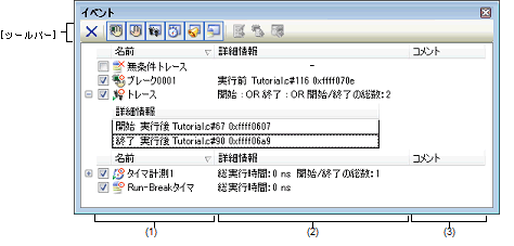 エディタ パネル/逆アセンブル パネル/ウォッチ パネル上で設定したイベントの詳細情報の表示,設定状態の有効/無効の切り替え,および削除などを行います(「2.17 イベントの管理」参照)。