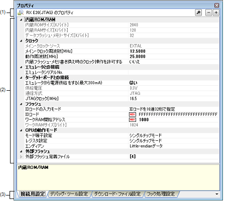プロジェクト・ツリー パネルで選択しているデバッグ・ツールについて,カテゴリ別に詳細情報の表示,および設定の変更を行います。