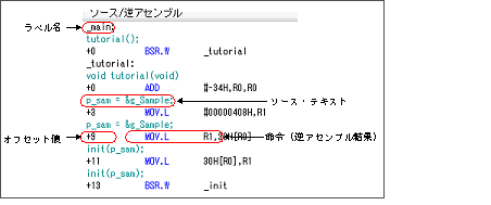 混合表示モード/逆アセンブル表示モードを選択している場合,対応する命令(逆アセンブル結果)を表示します注。ニモニックは強調表示されます。 |