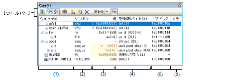 配列,ポインタ型変数,構造体/共用体/クラス,レジスタ(部分を表す名前がついているもののみ)を示すウォッチ式の先頭には,“+”マークを表示し,これをクリックすることにより次を展開表示します(展開後“-”マークに変化)。