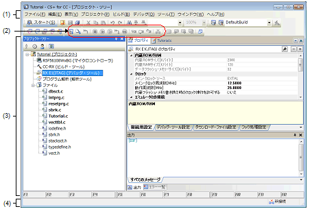 デバッグを行う際は,このウインドウからプログラムの実行制御,および各パネルのオープン操作を行います。