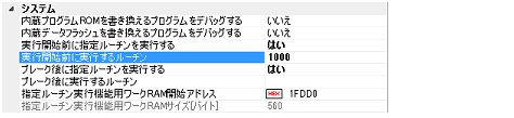 なお,[実行開始前に指定ルーチンを実行する]または[ブレーク後に指定ルーチンを実行する]プロパティのいずれかで[はい]を選択すると,[指定ルーチン実行機能用ワークRAM開始アドレス]プロパティが表示されます。指定したワークRAMの配置アドレスから[指定ルーチン実行機能用ワークRAMサイズ[バイト]]プロパティの表示サイズ分を,指定ルーチン実行機能用ワークRAM領域としてデバッガのファームウェアが使用します。