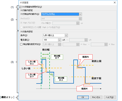 トリガを検出する場合はチェック・ボックスを選択し,時間幅の条件と時間幅を指定します。