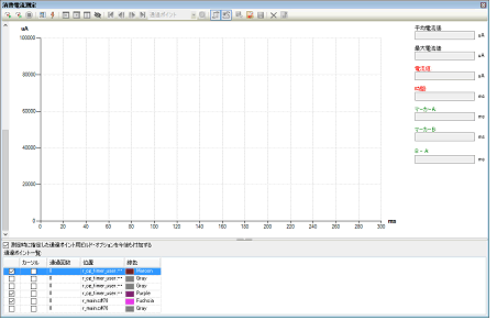 現在設定されている通過ポイントの一覧は,消費電流測定 パネル【E2】の下部に表示されます。