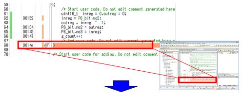 ソース中の意図的な場所でプログラムを停止させたい場合は,ソフトウエア・ブレークを設定することで,実行前ブレークすることができます。