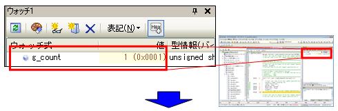 ウォッチ・パネルを確認すると,[g_count]の値が1にカウント・アップされています。 |