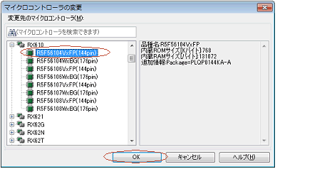 変更先のマイクロコントローラを選択した後,[OK]ボタンをクリックします。