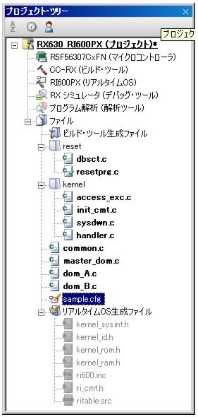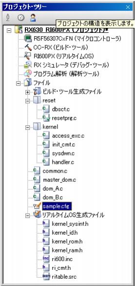 備考1 プロジェクト・ツリー パネルにシステム・コンフィギュレーション・ファイルを追加すると,リアルタイムOS生成ファイル・ノードが表示されます。
