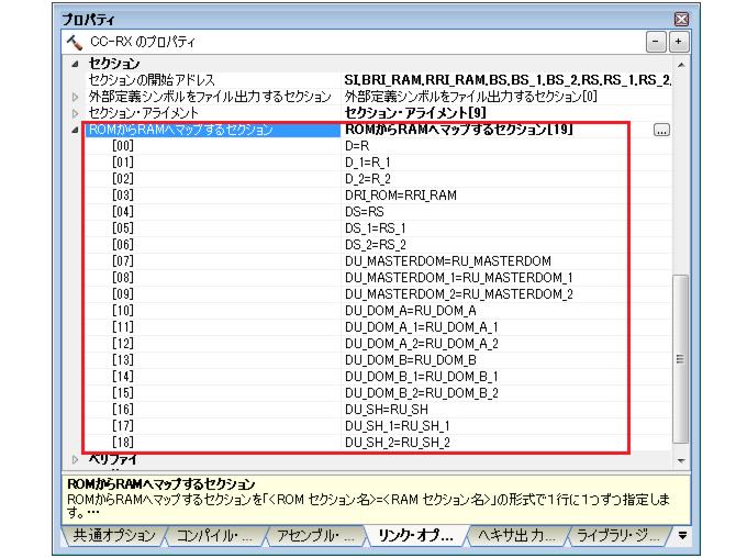 セクション情報ファイル(ユーザ・オウン・コーディング部)のDTBLに記述した初期化データセクションは,リンカのオプション“-rom”を用いてROMに配置されたセクションをRAM上のセクションにマップする設定を行う必要があります。図2-8のように,[CC-RX(ビルド・ツール)]の[プロパティ] パネルの[リンク・オプション]タブの[セクション]カテゴリを設定してください。
