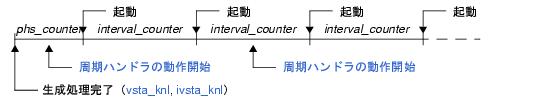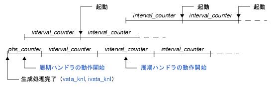 本サービス・コールの発行時点を基点とし,起動周期(interval_counter)にしたがって起動タイミングが設定されます。