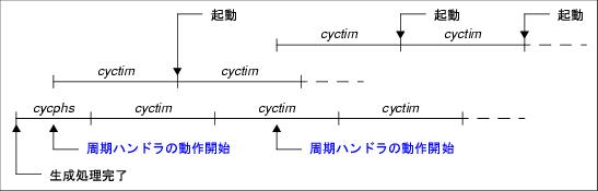 コンフィギュレーション時に定義した起動位相(初期起動位相cycphs,起動周期cyctim)で対象周期ハンドラに対する起動タイミング設定処理が行われます。