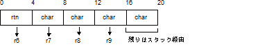 char型の引数4個を渡すだけでも,戻り値によっては,4番目の引数がスタック渡しとなる場合があります。