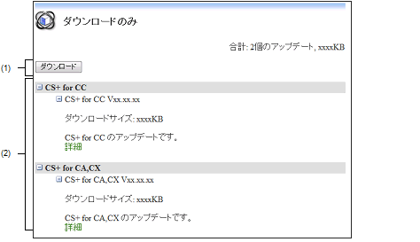 CS+ アップデート・マネージャ ウインドウのメニューエリアで[ダウンロードのみ]をクリック