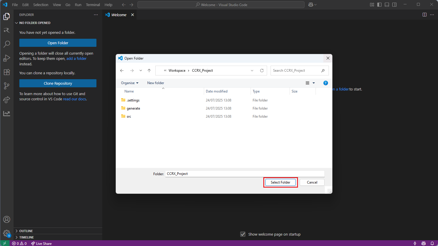 In [Open Folder] dialog, browse to project folder and click [Select Folder] button.