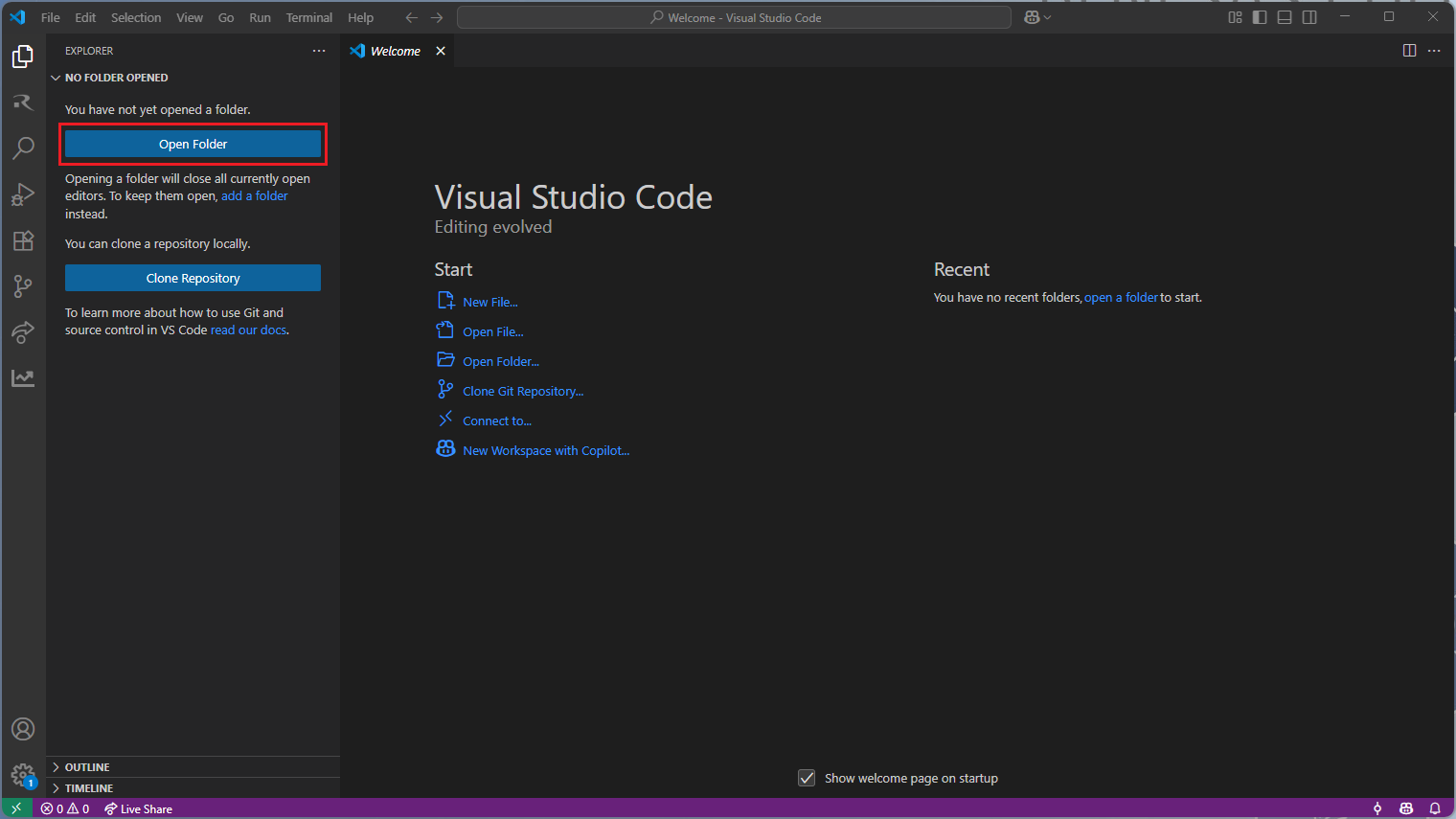 In [Explorer] view, select [Open Folder] button if available. If not, select [File] → [Open Folder…] menu item.